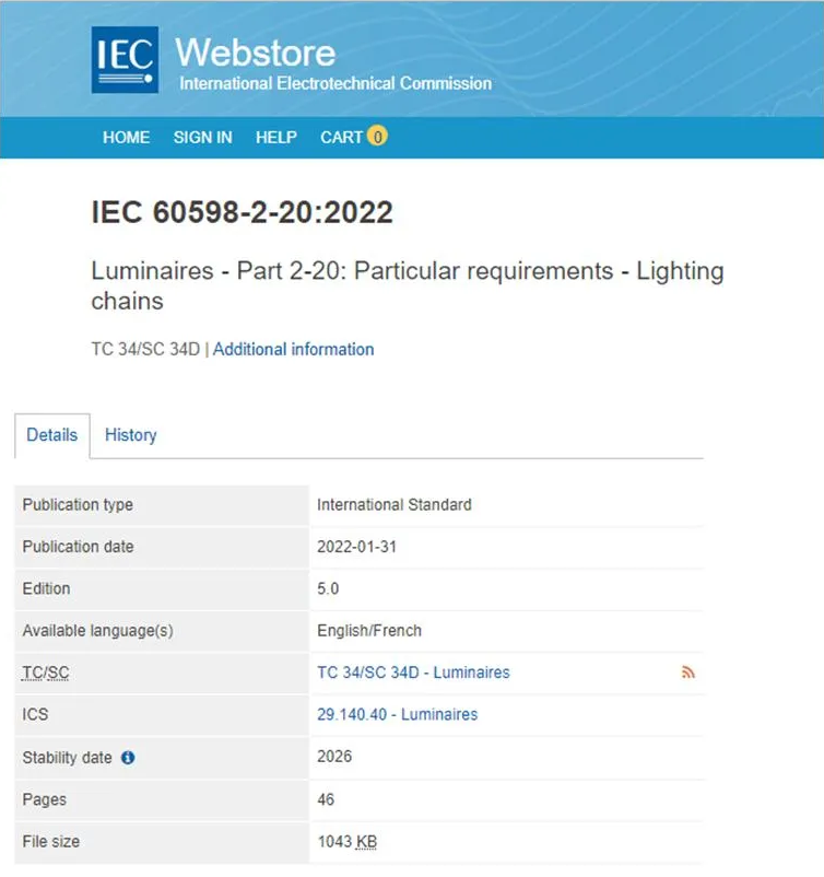 IEC 60598-2-20:2022《灯具-第2-20 部分:特殊要求-灯串》已于2022年1月31日正式发布。该标准规定了在室内或室外使用,电源电压不超过250V的装有串联、并联或串联/并联连接光源组合的灯串的要求。